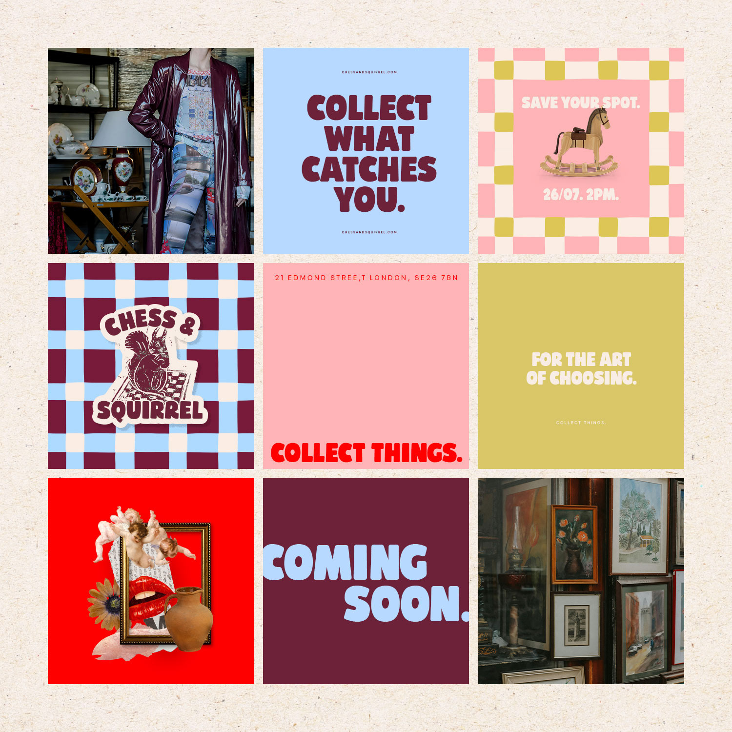 A full visual identity for an art buying company with a nostalgic, collectible spirit and a gently eccentric edge. The brand draws on ideas of retro craft, antique objects, small obsessions, and carefully curated finds, shaping a visual world that feels considered, characterful, and quietly distinctive. The work extended across a complete suite of assets, including social content, packaging builds, and overarching brand storytelling.